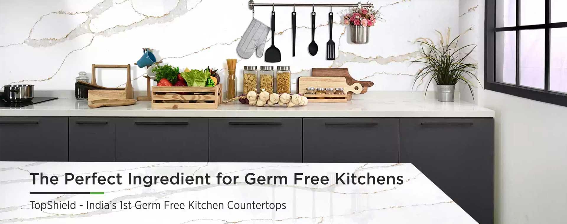 Beauty of natural stone untouched by germs. Presenting Topshield, India's 1st germ free Quartz kitchen countertops.